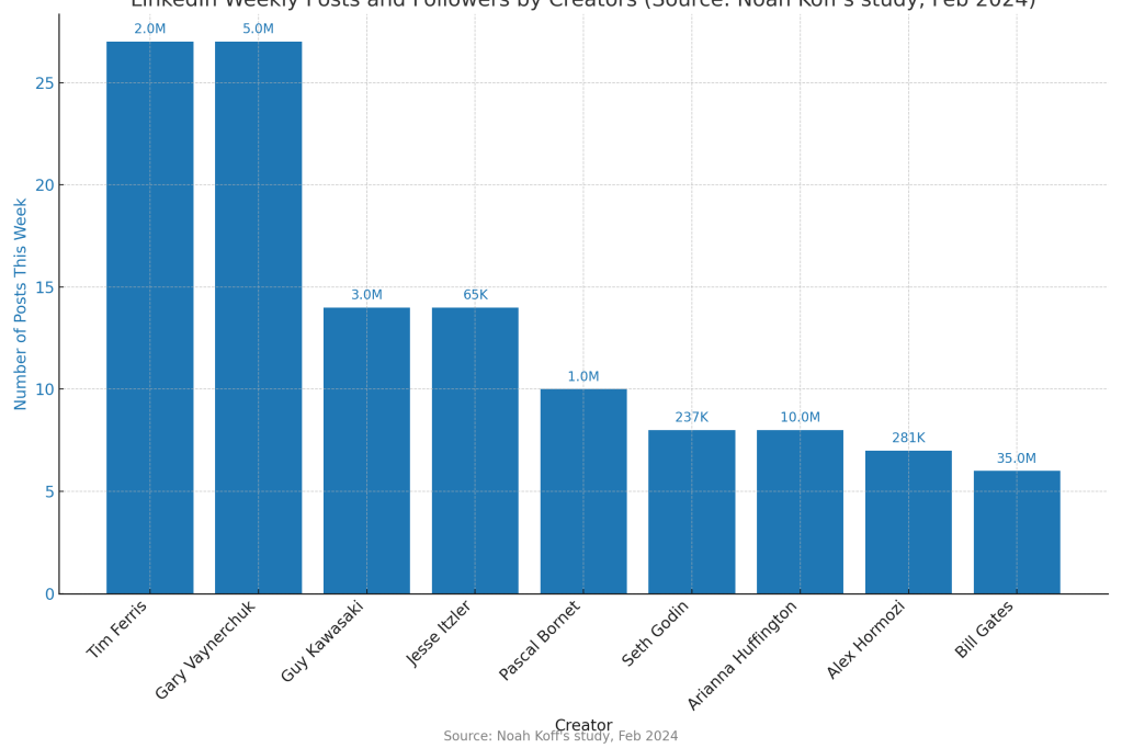 2. Be Consistent — People who publish daily get more reach and engagement. My study into Top Voices at the mid and high range (250k audiences and up, see chart below) shows that posting twice daily is the norm. If you are starting on your path to an audience of 10K, like I did in 2023, a simple way to think about it is to post quality content at least once a day.